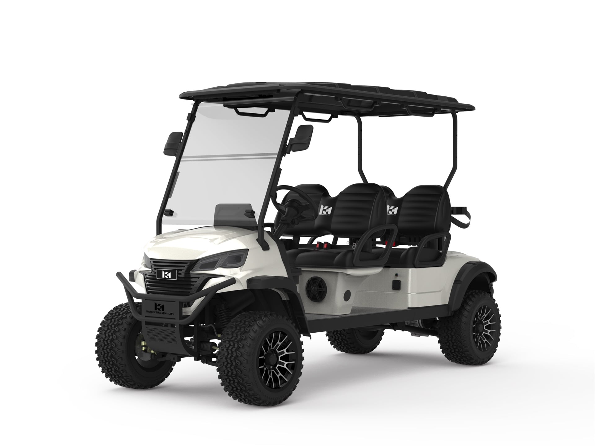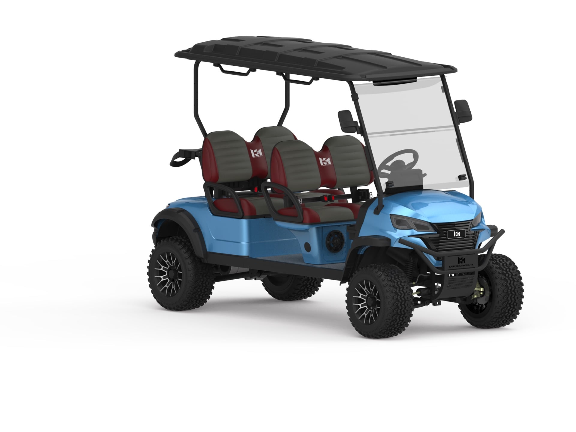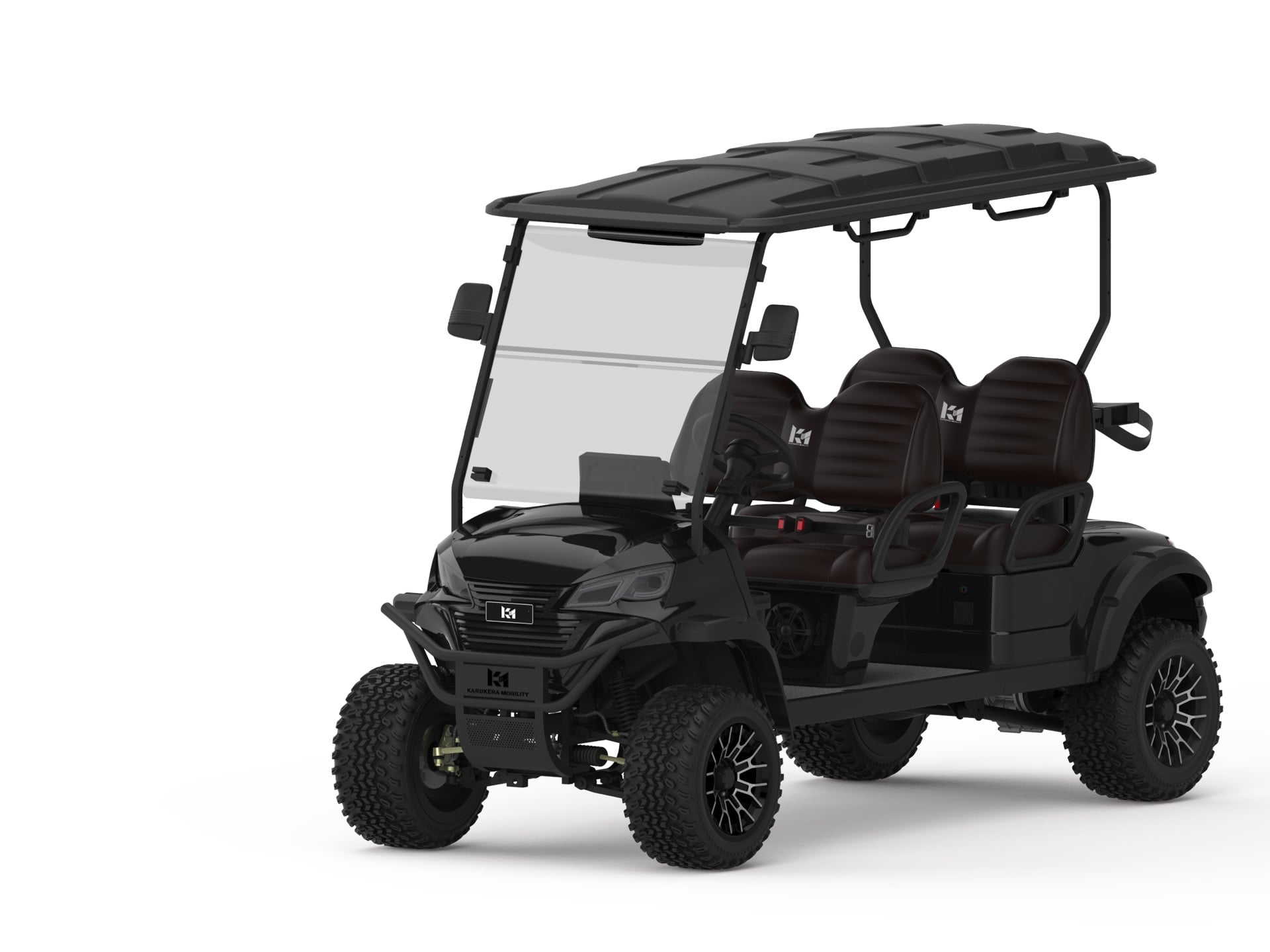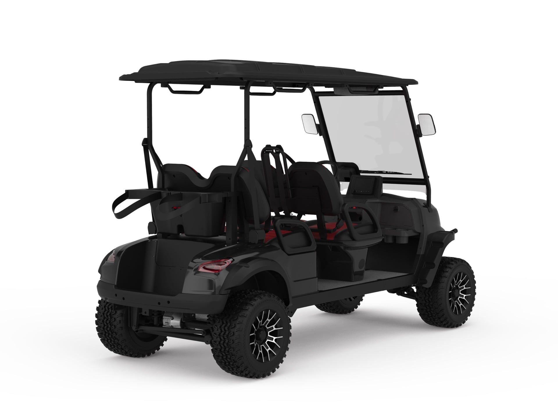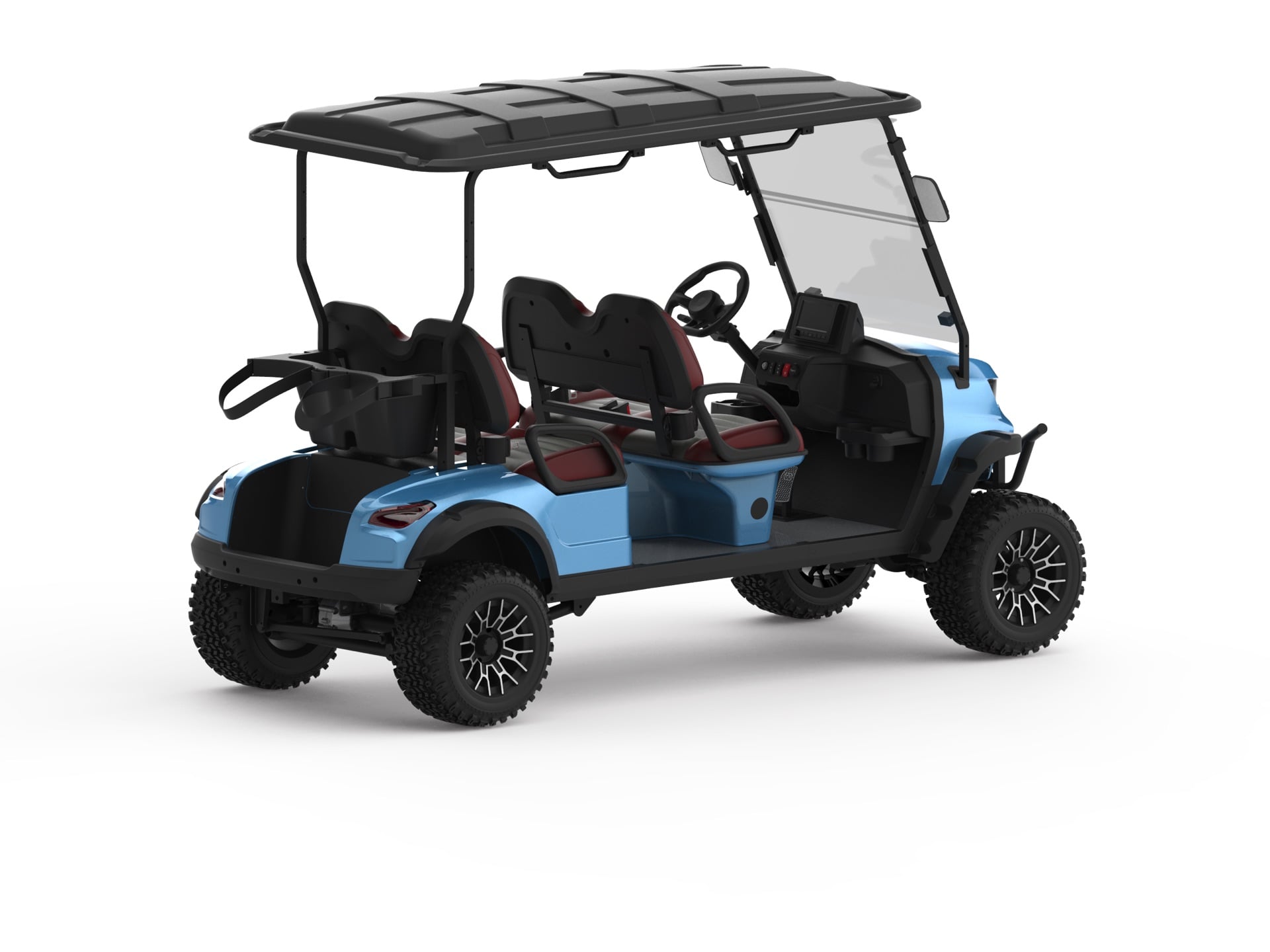 Quadricycle électrique robuste, équipé d’un châssis rehaussé et de pneus tout-terrain, conçu pour affronter tous types de chemins, même les plus accidentés.