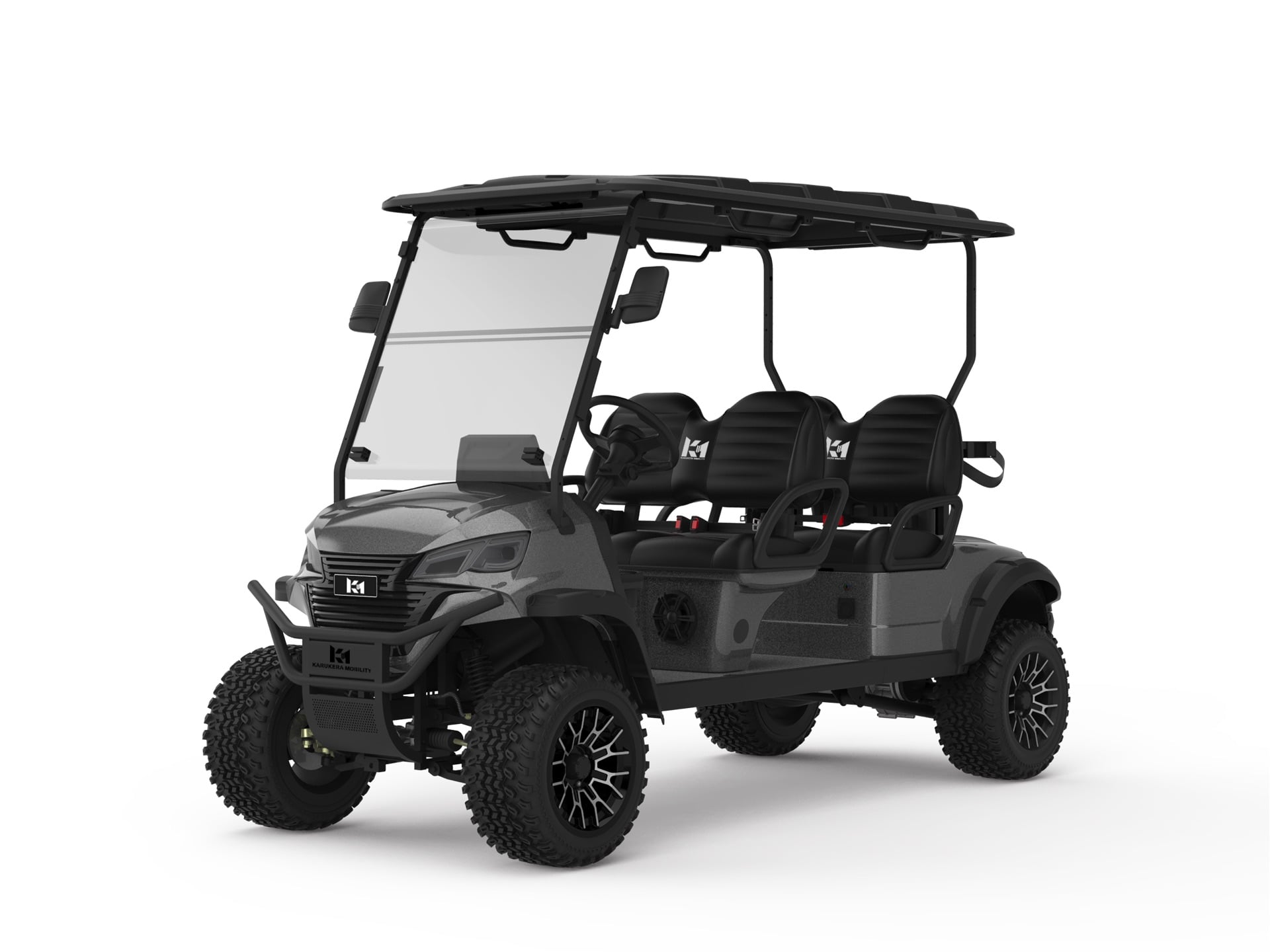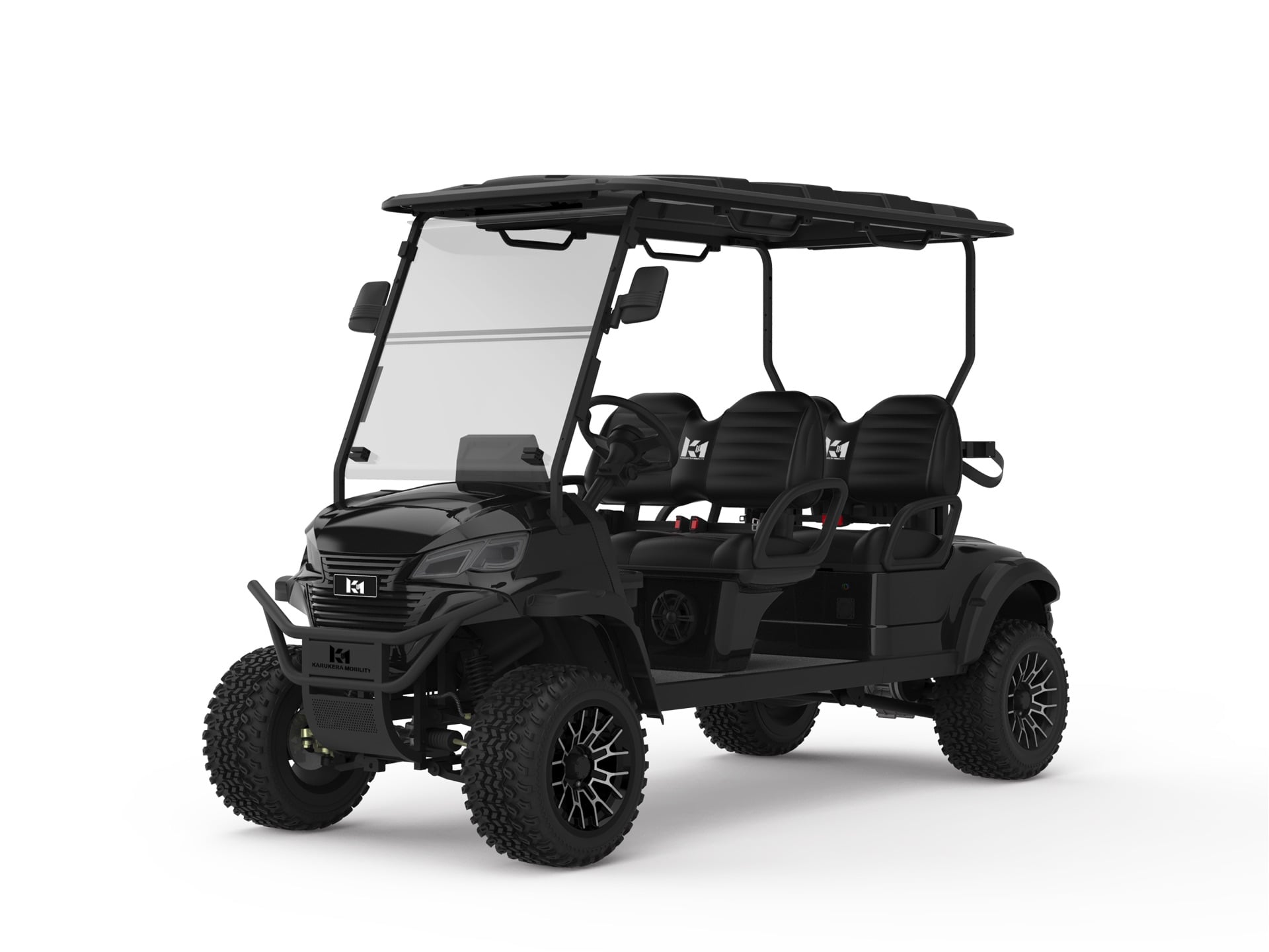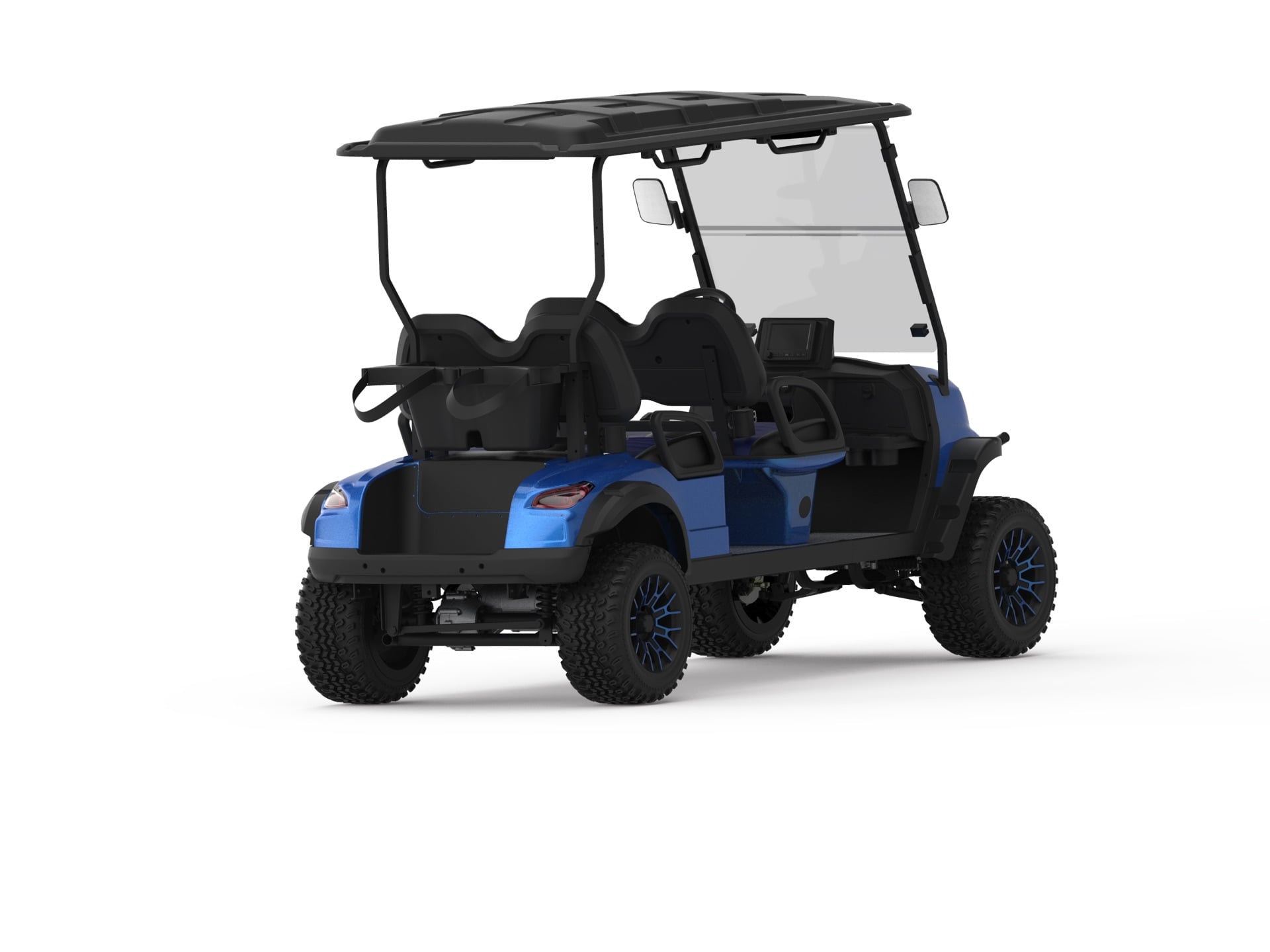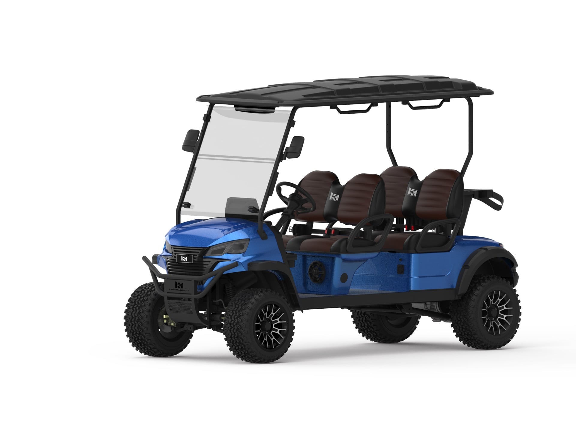 Quadricycle électrique robuste, équipé d’un châssis rehaussé et de pneus tout-terrain, conçu pour affronter tous types de chemins, même les plus accidentés.